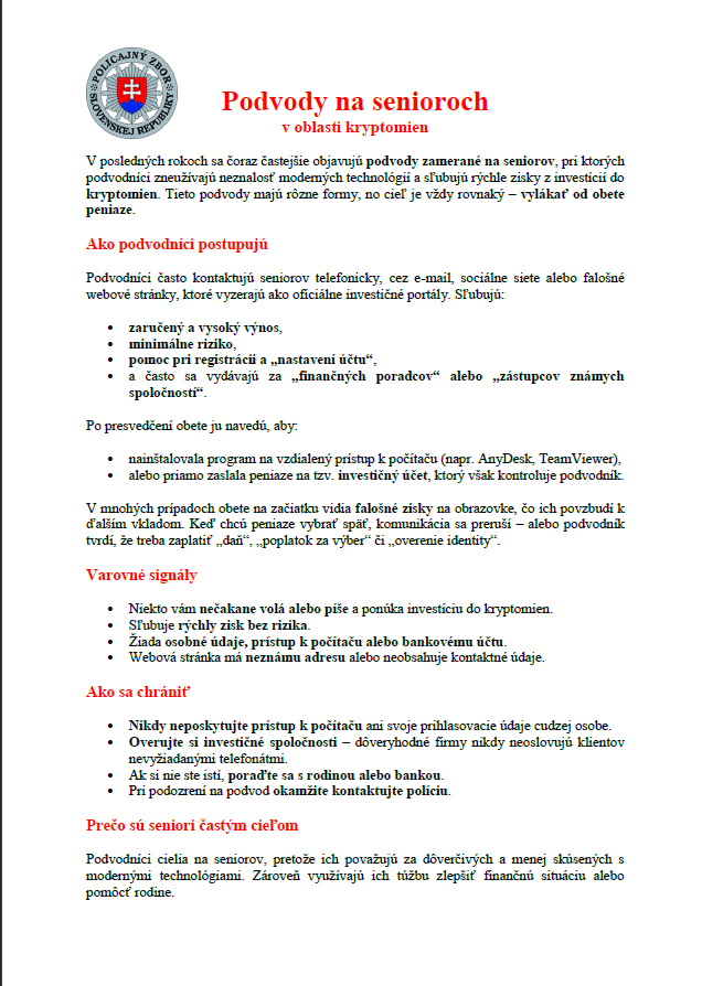 POZOR - Podvody na senioroch v oblasti kryptomien