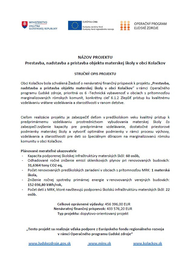 Prestavba, nadstavba a prístavba objektu materskej školy v obci Kolačkov